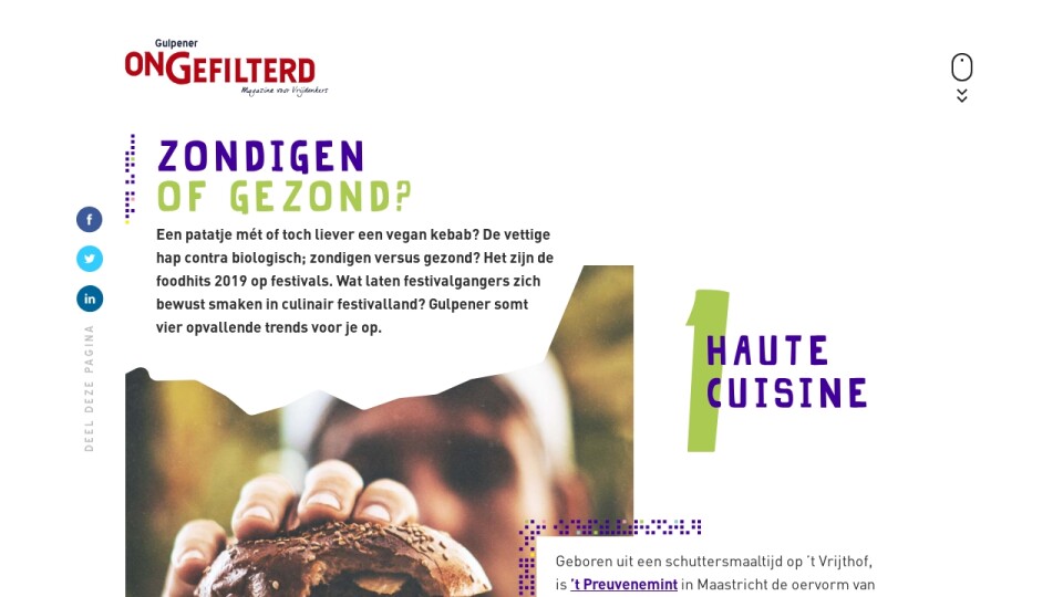 Een patatje mét of toch liever een vegan kebab? De vettige hap contra biologisch; zondigen versus gezond? Het zijn de foodhits 2019 op festivals. Wat laten festivalgangers zich bewust smaken in culinair festivalland? Gulpener somt vier opvallende trends voor je op.