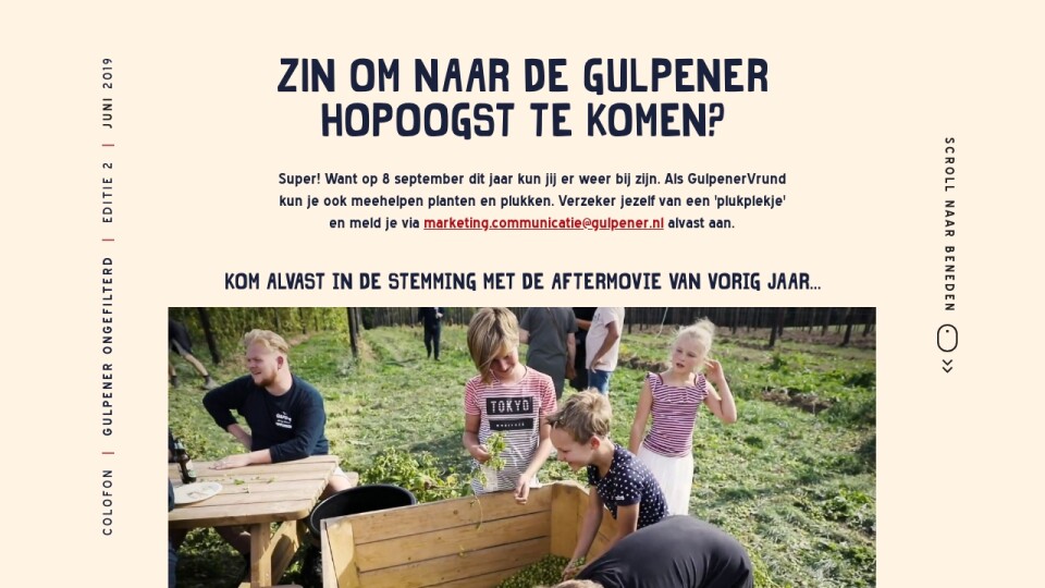 Super! Want op 8 september dit jaar kun jij er weer bij zijn. Als GulpenerVrund kun je ook meehelpen planten en plukken. Verzeker jezelf van een 'plukplekje' en meld je via marketing.communicatie@gulpener.nl alvast aan.